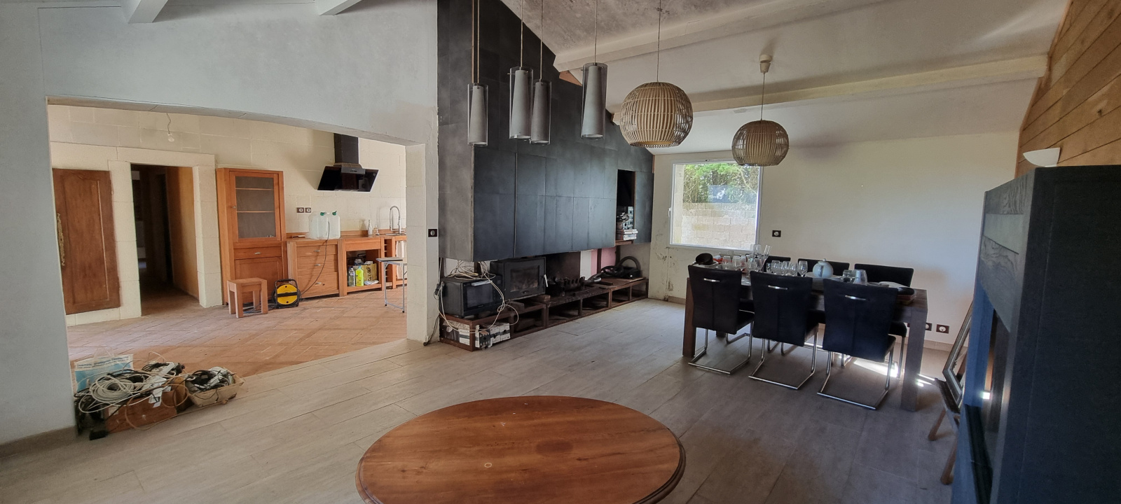 Cuisiine ouverte sur une grande pièce de vie et sa cheminée